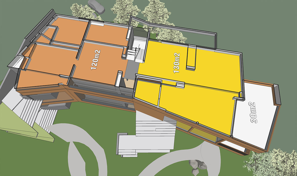 Koncepčná štúdia obytného komplexu so službami a rozšírenou vybavenosťou v Liptovskom Hrádku. Prvá fáza – hmotový koncept. Je to náhľad do procesu tvorby v našom ateliéri. Takéto hmotové rozloženie s hrubou ideou dizajnu a približným členením na funkčné celky si pripravíme na prvé stretnutie s klientom po odsúhlasení zadania.